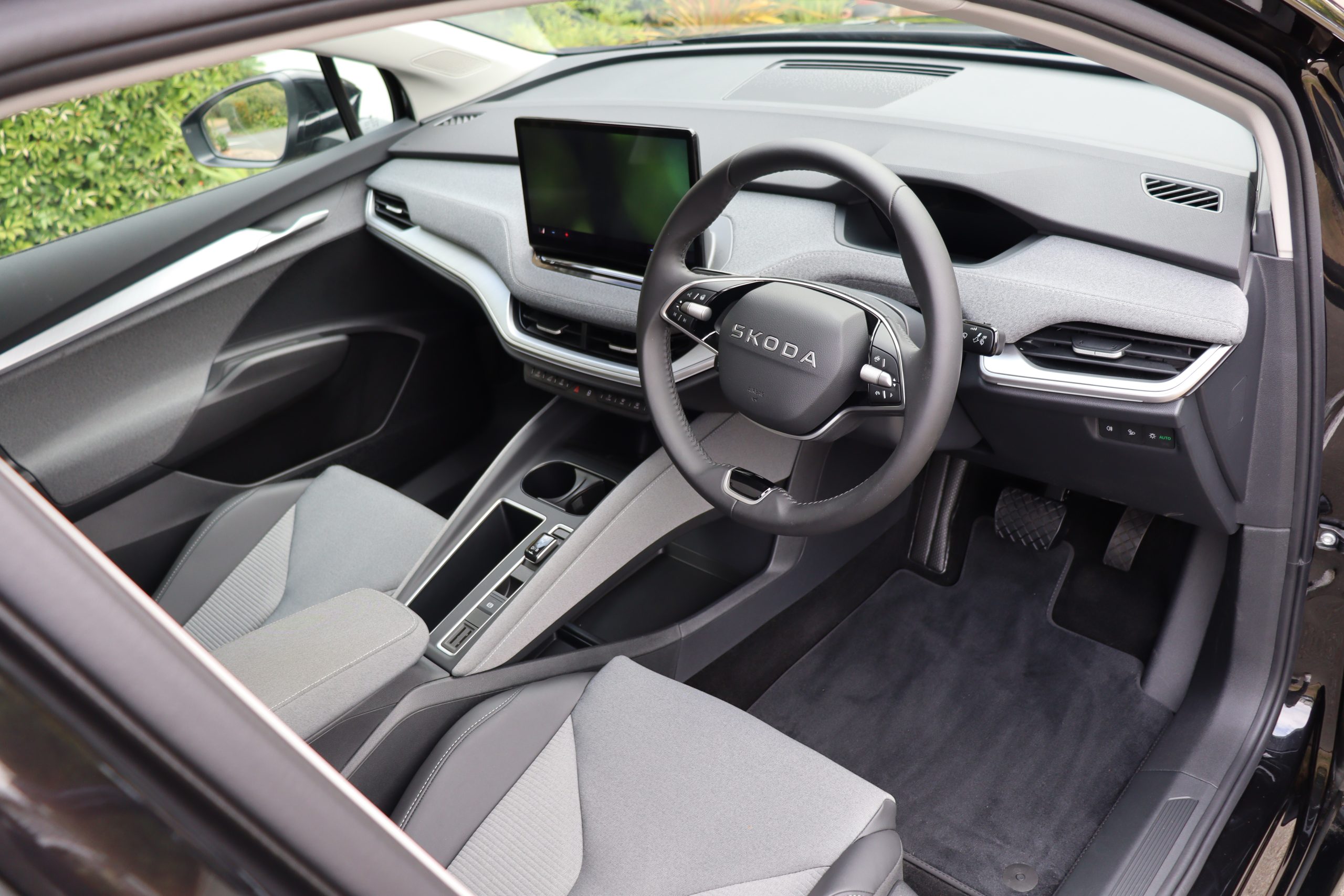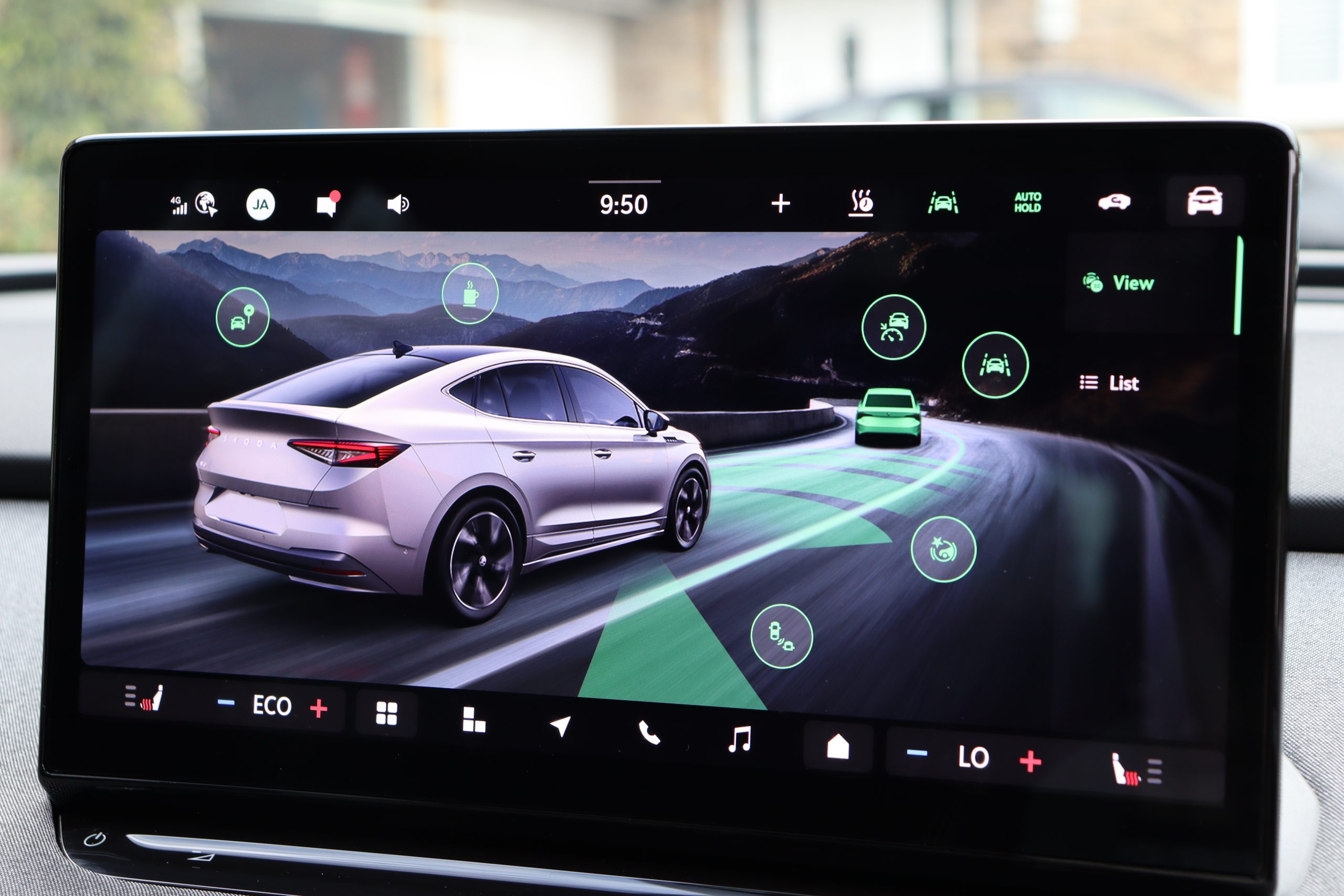 Gesture control, Power assist steering, Predictive adaptive cruise control with traffic jam assist, Rear view camera, Satellite navigation system, Skoda Connect iV remote services with charging, air conditioning and smart schedules, Speed assist, Speed limiter, Traffic sign recognition, Travel assist plus with emergency assist, lane assist plus with narrow lane assist and urban evasive steering support, Voice control system, Wi-Fi hotspot, Wireless smartlink.